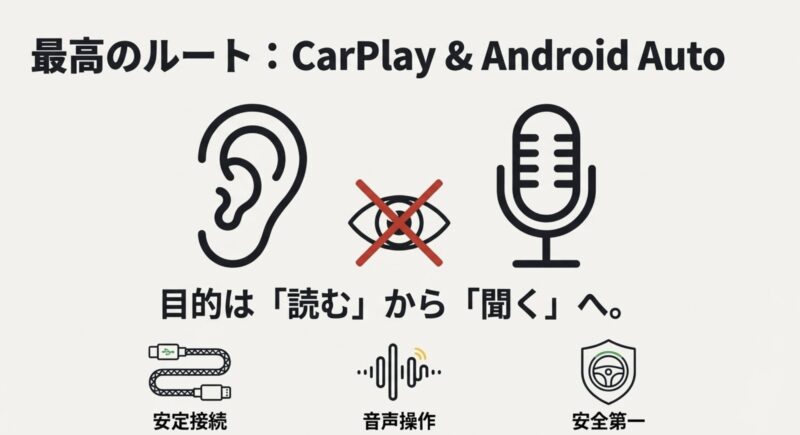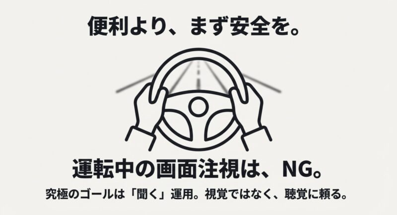 結局、運転中の通知は“見る”より“聞く”に寄せたほうが、安全にもストレスにも効きます。