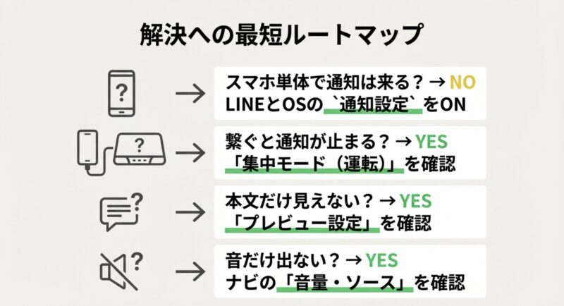 カーナビでLINE通知を受けたいのに、表示されない・本文が見られない・音が出ない…ここ、気になりますよね。