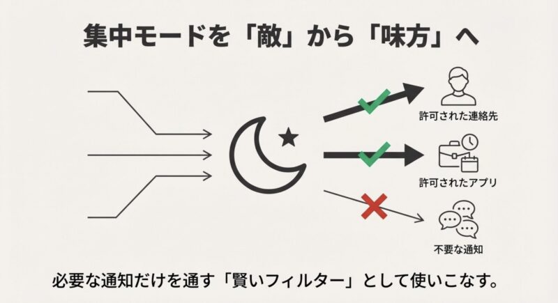 そういうときは、通知をゼロにするのではなく、必要な範囲だけ通す設計にすると快適です。