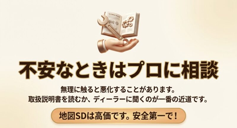 不安が強い場合や、地図更新・起動不能など重い症状が出ている場合は、販売店・ディーラーなど専門家へ相談して、無理に自己判断で進めないのがおすすめです。