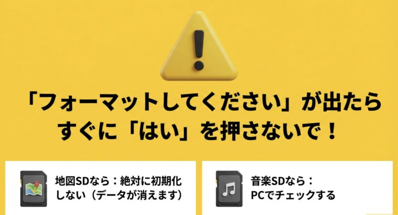 地図SDは基本的にフォーマット厳禁。正確な対応は取扱説明書・公式サポートの案内を確認し、最終的な判断は販売店・ディーラーなど専門家に相談するのが安全です。