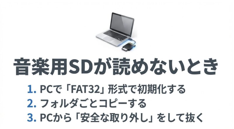 後半の「認識しない・読み込まない原因」と「FAT32で初期化と音楽入れ方」で、具体的に手順化します。