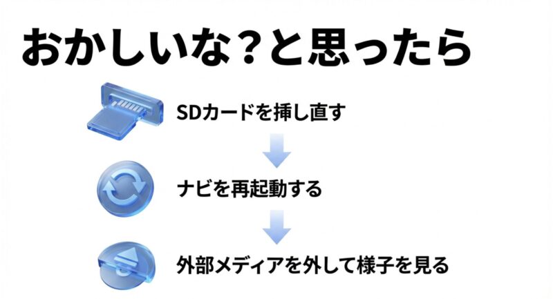 もし「抜いちゃった…」なら、慌てずにSDカードを挿し直し、いったんナビを再起動して挙動を確認しましょう。