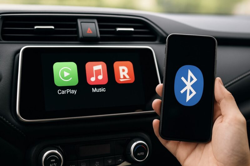 - FMトランスミッター:シガーソケットに挿し、iPhoneとBluetoothで接続。再生した音楽をFM電波で飛ばし、車のFMラジオで受信します。最も手軽な方法の一つです。