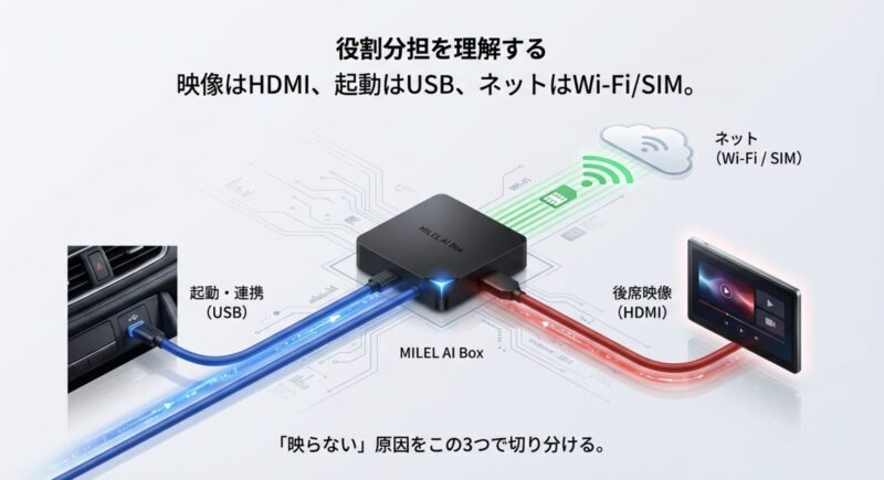 感覚としては、車側に入るのはUSB、後席に出すのはHDMI、ネットはWi-FiかSIM。まずこの3本柱で考えると混乱しにくいですよ。