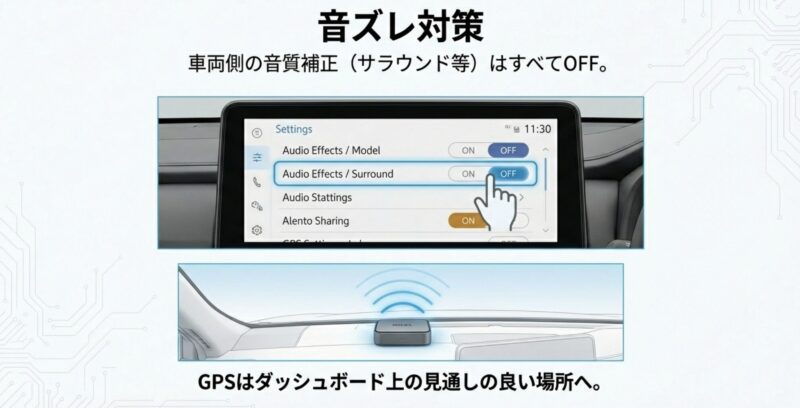 音ズレって、どこか一箇所が悪いというより、「AI BOX→車→スピーカー」までの経路で少しずつ遅延が積み重なることが多いです。