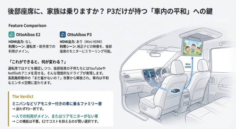- ファミリー層:後部座席のモニターにも映像を映したい(HDMI出力必須)。