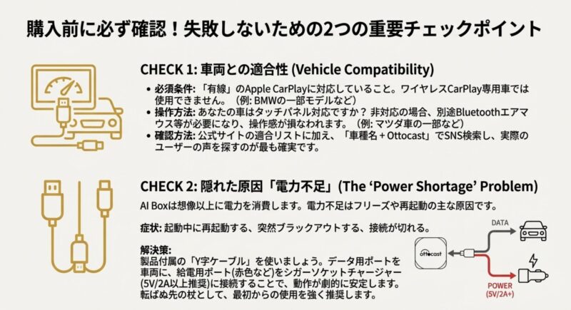 公式サイトやAmazonの商品ページにある適合リストをチェックするのはもちろんですが、SNSなどで「車種名 + Ottocast」で検索して、実際に使っている人の口コミを探すのが最も確実な方法です。