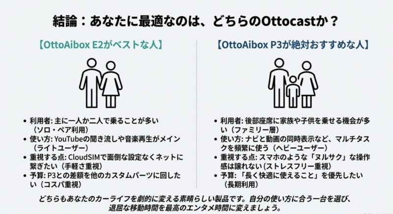 ここまでOttocastのE2とP3を比較してきましたが、最終的にどちらを選ぶべきか、私の結論をお伝えします。