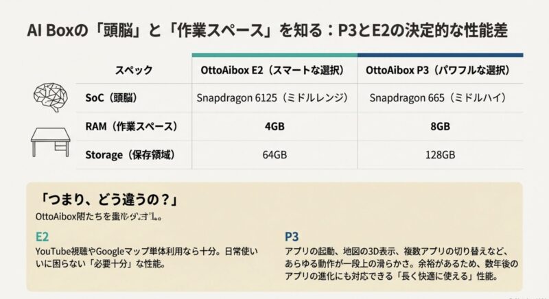 運転中にトイレ休憩でコンビニに寄り、エンジンを切って再始動した際、P3ならさっき見ていたYouTubeの続きがすぐに再生されるのに、E2だとアプリが最初から再起動してしまい、また動画を探し直さなければならない…といった地味なストレスが発生するのは、このRAM容量の差が原因であることが多いのです。