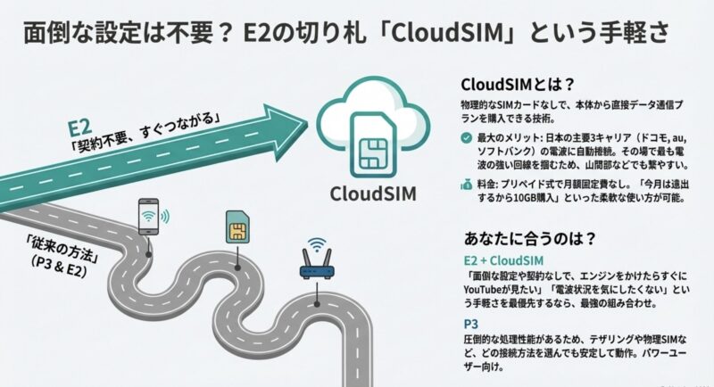 E2の最大のウリであり、P3との差別化ポイントとも言えるのが「CloudSIM(クラウドシム)」機能の推し出し方です。