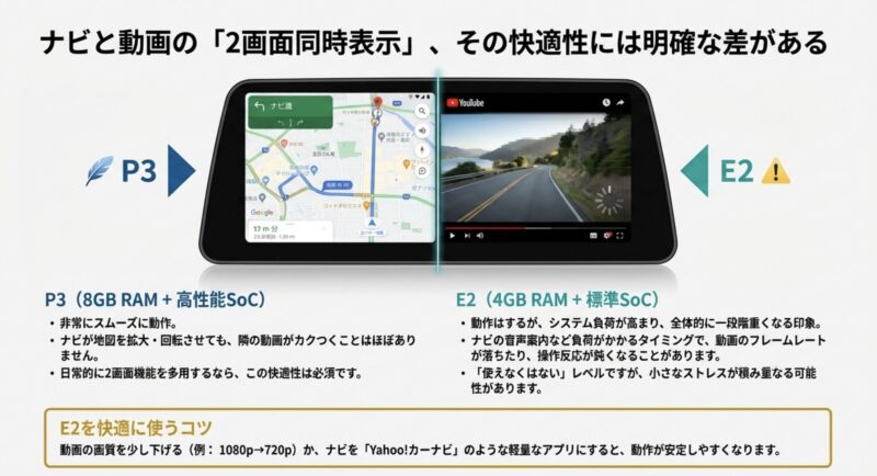 E2で2画面分割を快適に使うコツとしては、ナビアプリを「Googleマップ」のような重量級のものではなく、「Yahoo!カーナビ」などの比較的軽量なアプリにするか、あるいは動画の画質設定を少し落とす(1080pではなく720pにする)などの工夫をすると、負荷が減って安定しやすくなります。